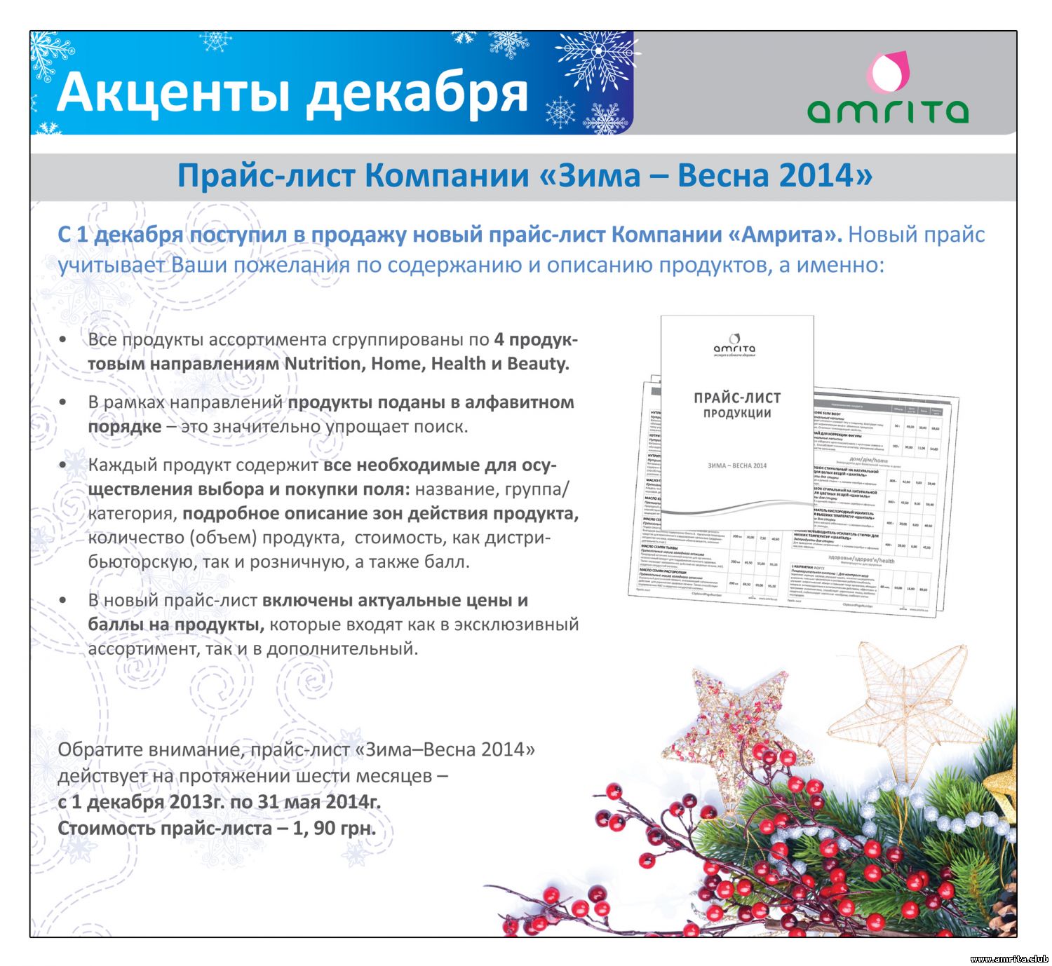 Предлагаем Вашему вниманию информационный лист «Акценты декабря 2013 года» с актуальными новостями об акциях, программах и новинках Компании «Амрита» в декабре 2013 года.