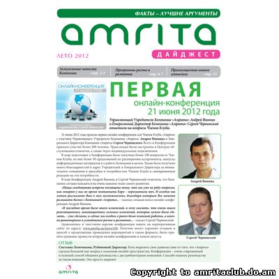 В новом, летнем номере дайджеста на первой полосе размещен обзор о том, как прошла первая онлайн-конференция с руководителями Компании: Управляющим Учредителем Компании «Амрита» Андреем Винником и Генеральным Директором Компании «Амрита» Сергеем Червинским. Вторая и третья полосы посвящены самым важным новостям Компании за период апрель-июнь 2012 года. На страницах дайджеста своими успехами делятся Изумрудные директора, а также Вы найдете вдохновляющий рассказ о том, как наши Лидеры возвращаются в «Амриту» и быстро достигают успеха! Двенадцатая и тринадцатая страницы дайджеста посвящены отчетам о прошедших в апреле-июне событиях, которые организовывала Компания и наши Лидеры. Не забыли мы рассказать и о социальных проектах, которые реализовывает Компания «Амрита» вместе с Вами!