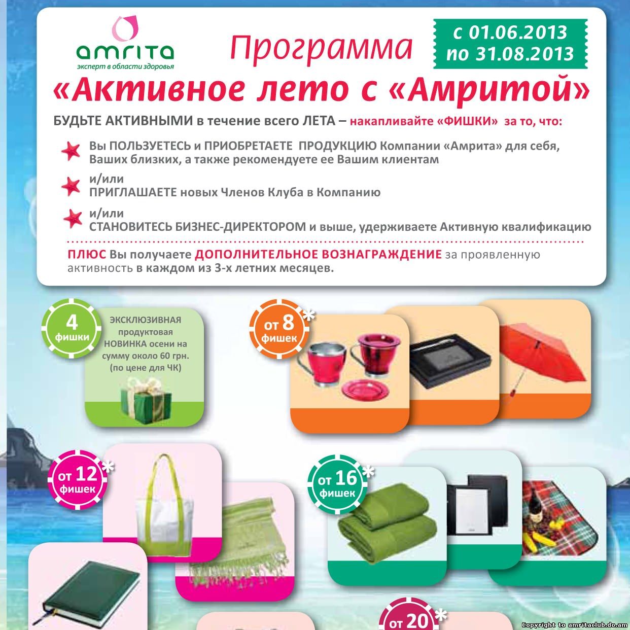 Программа «Активное лето с «Амритой» действует с 1 июня по 31 августа 2013 года. В течение этого периода выполняйте любые из вышеперечисленных условий и зарабатывайте «фишки». Собирайте столько «фишек» – сколько хотите подарков! Обратите внимание, что Вы получаете ДОПОЛНИТЕЛЬНОЕ ВОЗНАГРАЖДЕНИЕ за проявленную активность в каждом из трех летних месяцев!