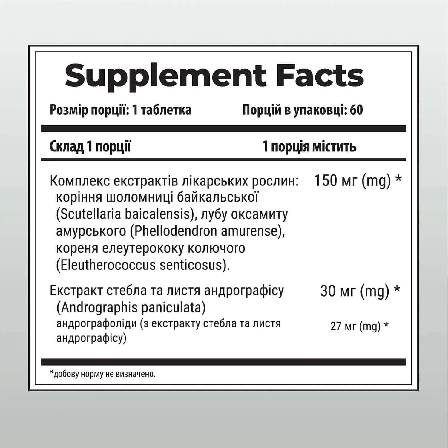 Активные компоненты: корни шлемника байкальского, луб бархата амурского, корни элеутерококка колючего, андрографис, андрографолиды.