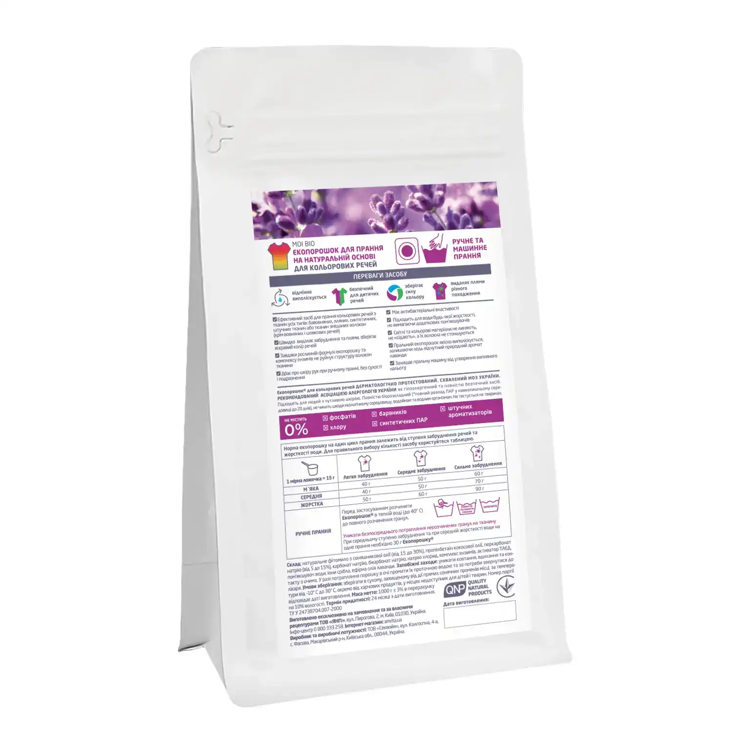 Безфосфатный экопорошок с ионами серебра и эфирным маслом лаванды. Подходит для ручной и машинной стирки. Эффективно удаляет любые загрязнения, сохраняет яркость цвета вещей и структуру тканей.