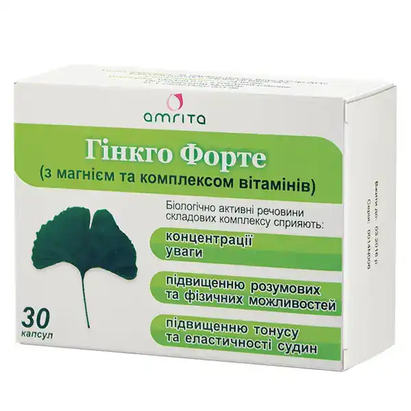 Продукт «Гинкго форте» усилен комплексом витаминов, минералов и биофлавоноидами, полифенолами, антиоксидантами экстракта белого чая. Аминокислота L-теанин, содержащаяся в белом чае, активизирует зоны головного мозга, отвечающие за внимание, кофеин белого чая усиливает краткосрочную память.