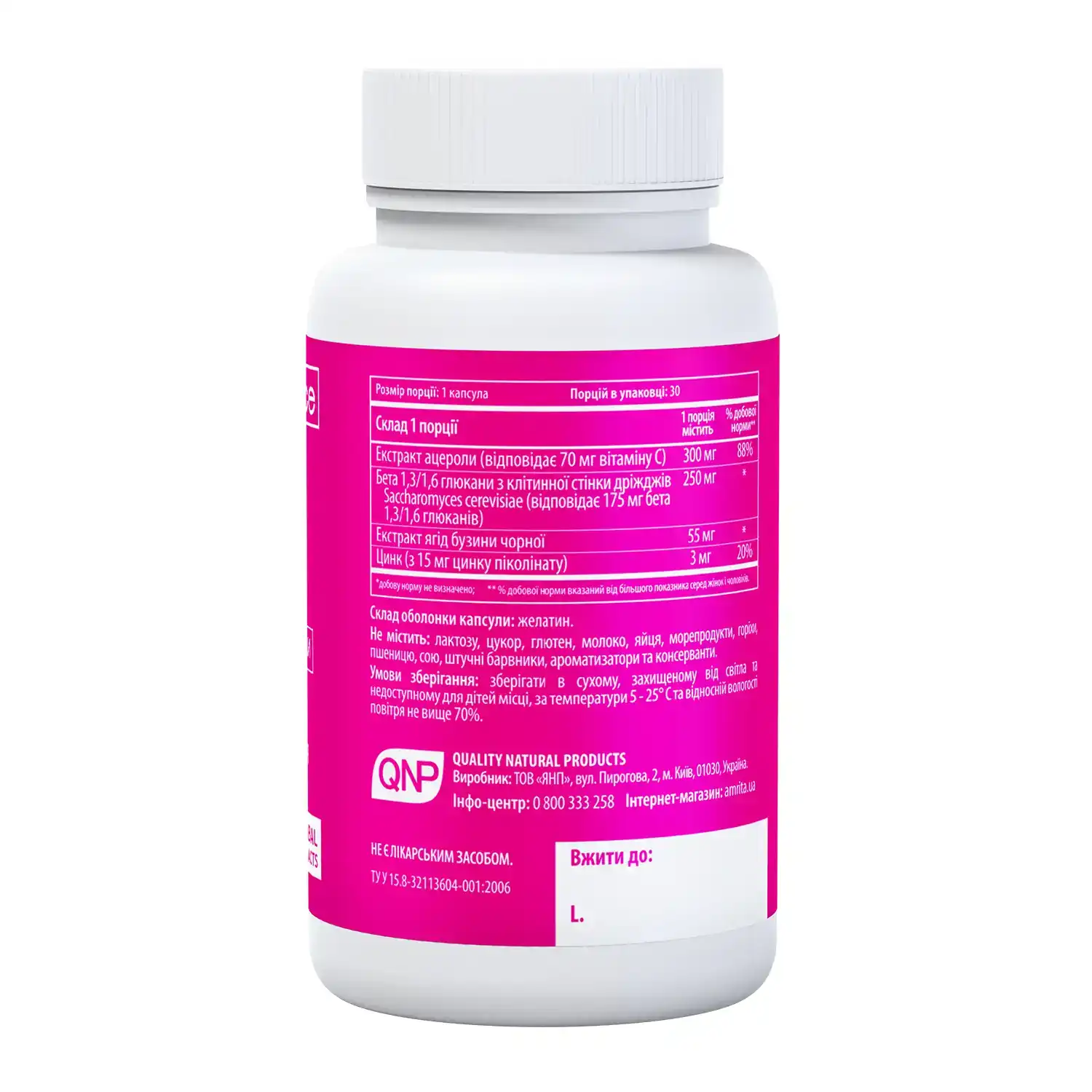 Состав активных ингредиентов на 1 капсулу: экстракт ацеролы 300 мг, что соответствует 70 мг витамина С, бета-1,3/1,6-глюканы из клеточной стенки дрожжей Saccharomyces cerevisiae – 175 мг; экстракт ягод бузины черной 55 мг, цинк 4 mg в форме цинка бисглицината.