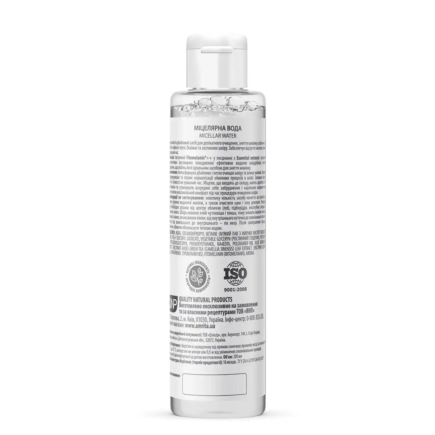 В составе косметики «Амрита» базовые компоненты сертифицированы органом сертификации ECOCERT (100% органика). Вся продукция производится согласно международного стандарта качества производства ISO 9001:2008, системы менеджмента качества – QNP.