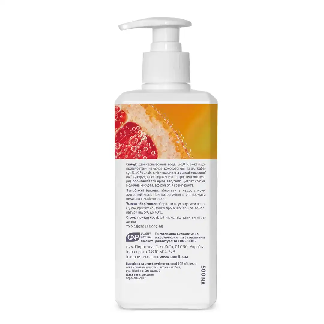 Состав: деминерализованная вода, 5-10 % кокамидопропилбетаин (на основе кокосового масла и масла бабассу), 5-10 % алкилполиглюкозид (на основе кокосового масла, кукурузного крохмала и тростникового сахара), растительный глицерин, загуститель, цитрат серебра, молочная кислота эфирное масло грейпфрута.