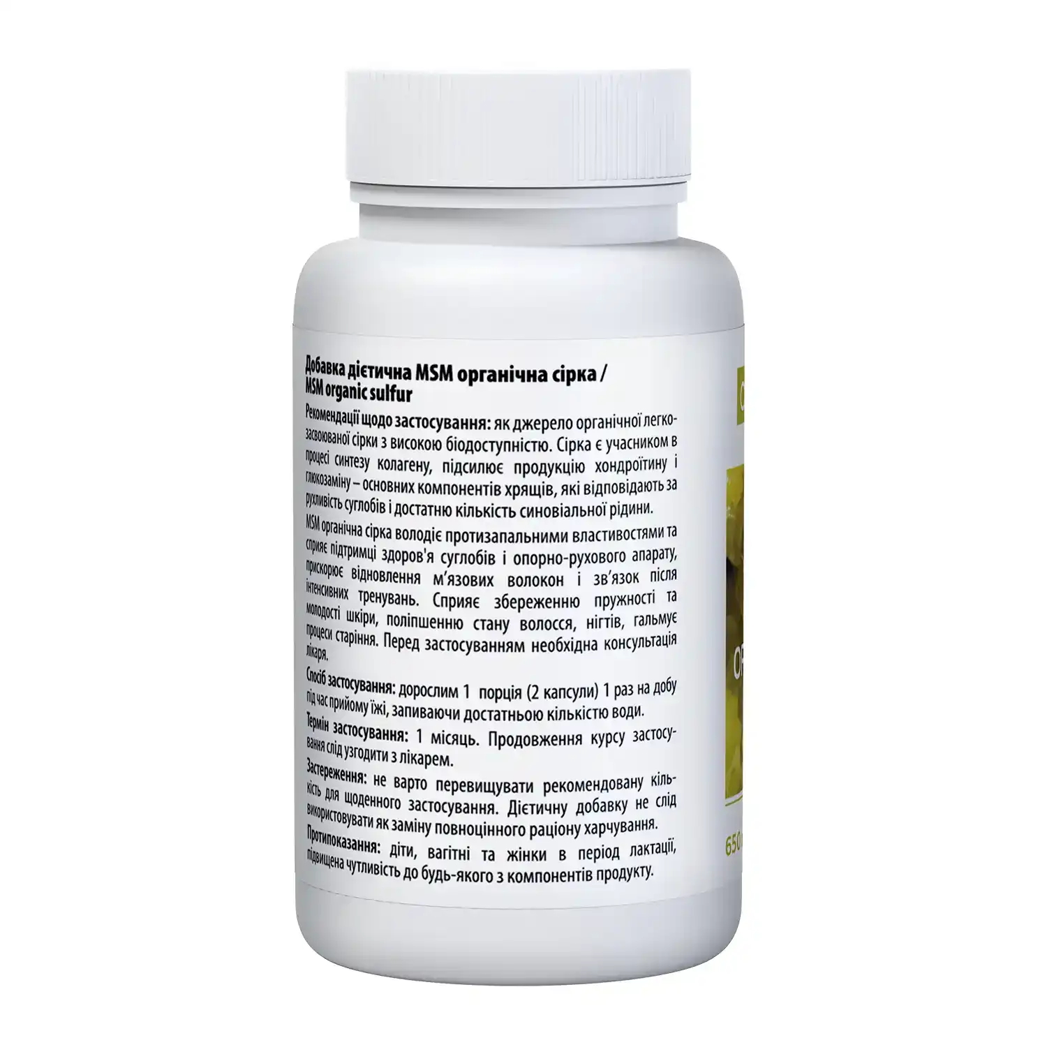 «MSM» – специальная органическая форма серы с высокой биодоступностью, которая лучше и быстрее усваивается, чем обычная сера. Эффективный источник полезных веществ для поддержания регуляции всех обменных процессов в организме. Органическая сера является участником в процессе синтеза коллагена, усиливает продукцию хондроитина и глюкозамина – основных компонентов хрящей, отвечающих за подвижность суставов и достаточное количество синовиальной жидкости. MSM органическая сера очень эффективна для оздоровления при артритах, артрозах, коксартрозах, остеохондрозе, подагре, пяточной шпоре и т.п. В комплексных программах обеспечивает защиту хрящей от разрушения, препятствует процессу дегенерации суставов. Повышает упругость мышечных волокон в области поясницы. Устраняет болевые ощущения во время движения.