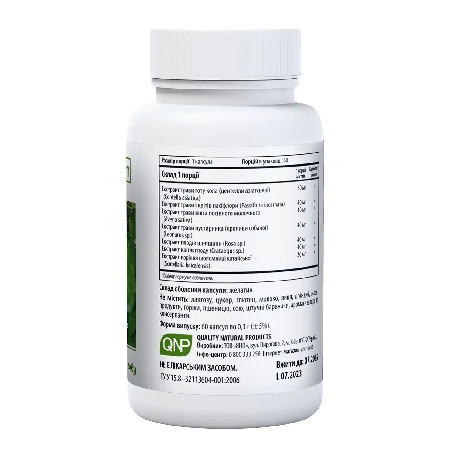 Активные компоненты: экстракты сухие центеллы азиатской (Готу Кола), пассифлоры, семена овса посевного молочно-восковой спелости, пустырника, плодов шиповника, цветков боярышника, корневищ с корнями шлемника байкальского.