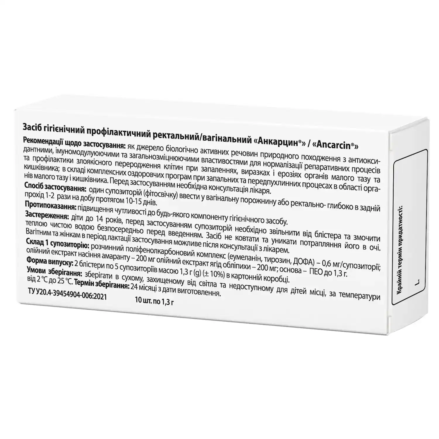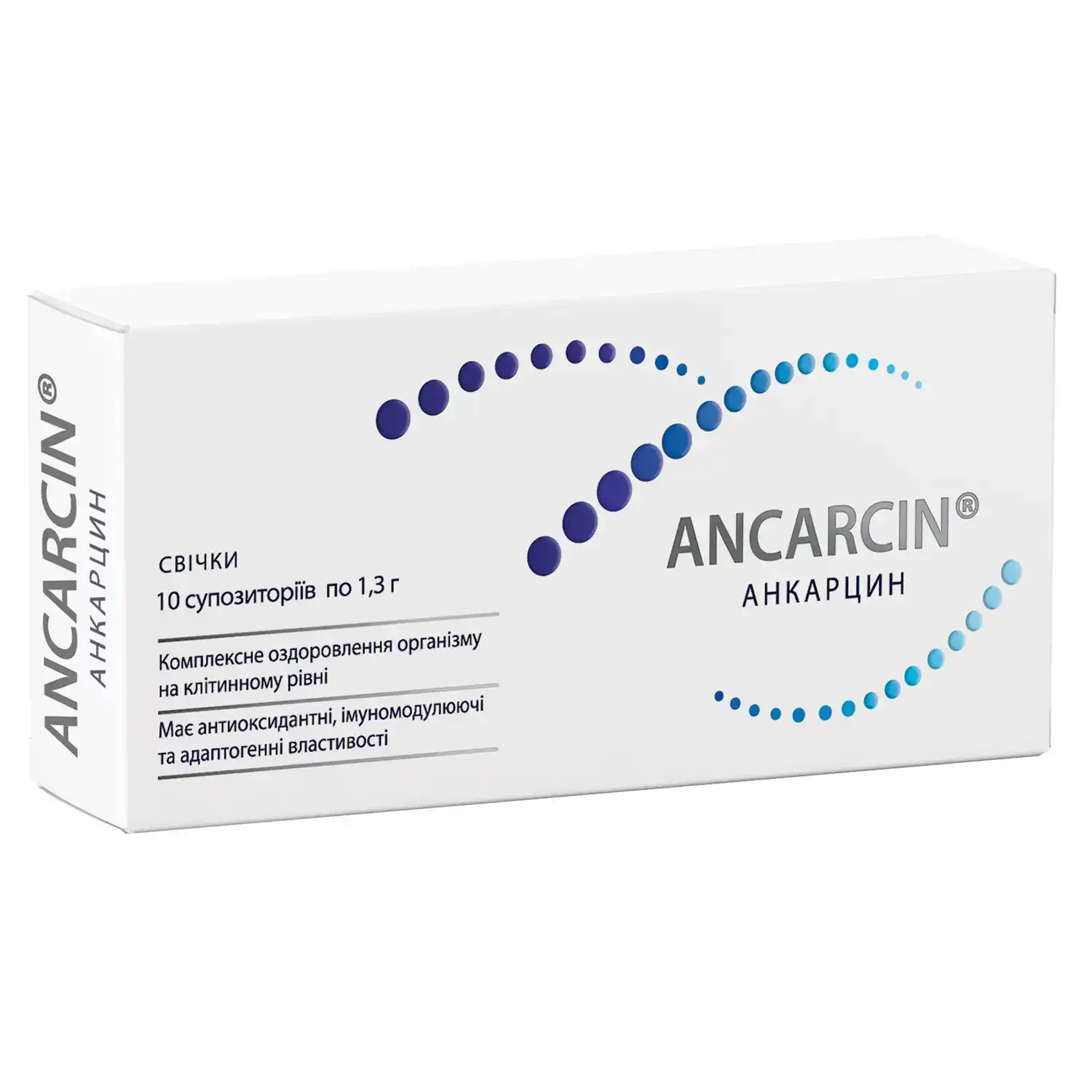 Склад Анкарцин® свічки (в розрахунку на 1 супозиторій): біотехнологічний розчинний поліфенолкарбоновий комплекс (еумеланін, тирозин, ДОФА) – 0,6 мг/1 супозиторій; олійний екстракт обліпихи 200 мг, олійний екстракт амаранту 200 мг; основа – ПЕО до 1,3 г.