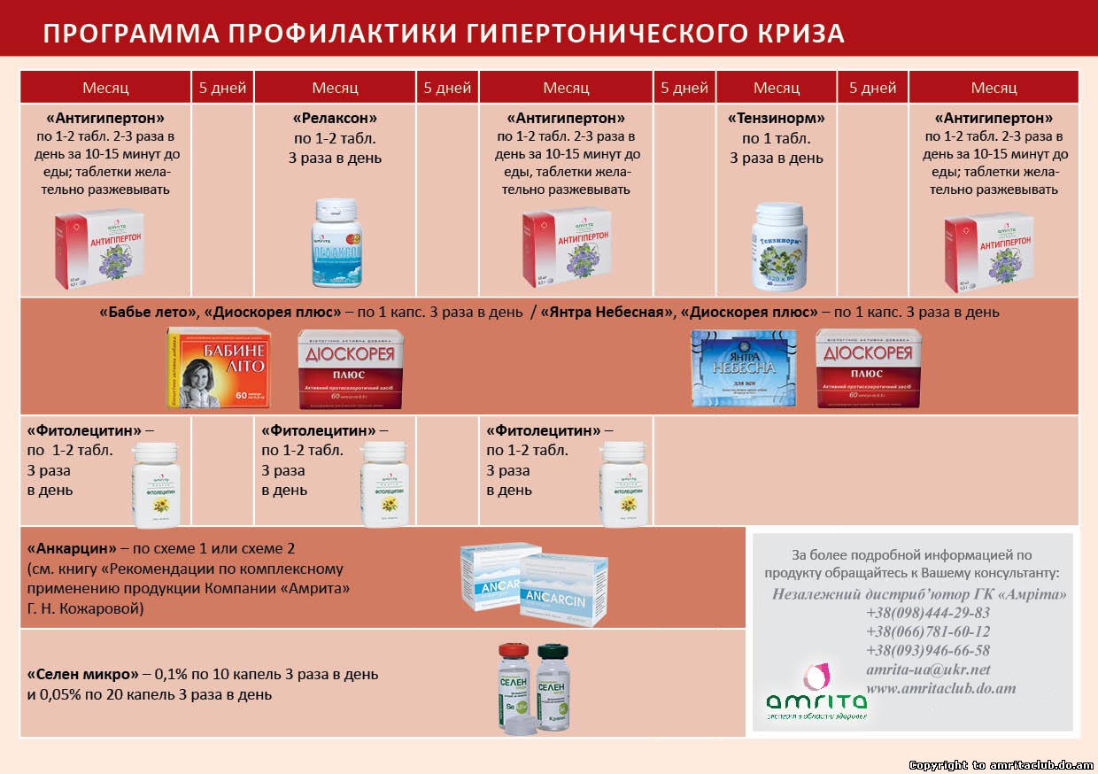 Для того щоб уникнути таких важких проявів гіпертонії, як гіпертонічний криз, слід пам’ятати про те, що терапія гіпертензії вимагає постійної підтримуючої терапії, в тому числі і фітозасобів. З цією метою фахівцями Компанії «Амріта» була розроблена схема профілактики ускладнень артеріальної гіпертензії, в тому числі і гіпертонічного кризу.