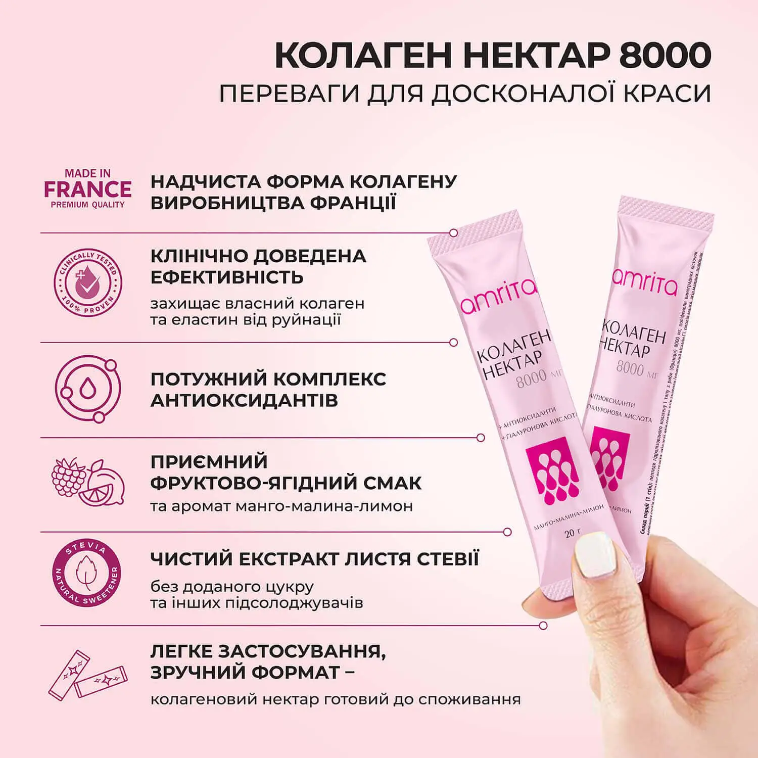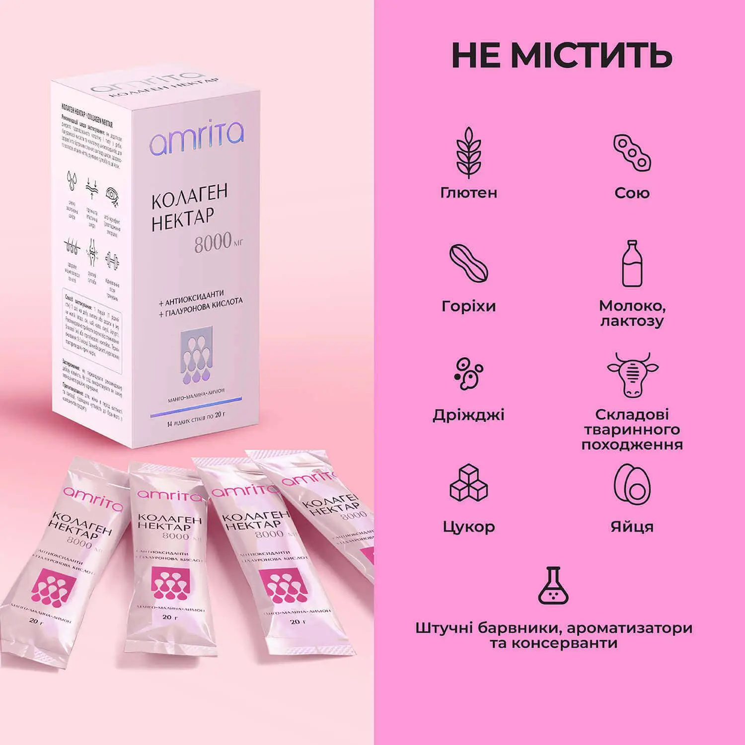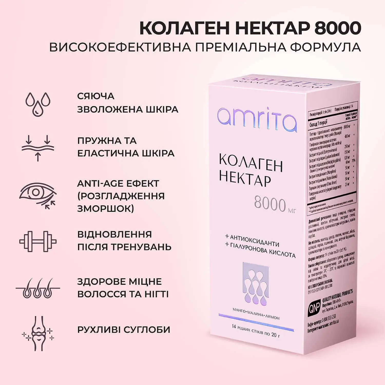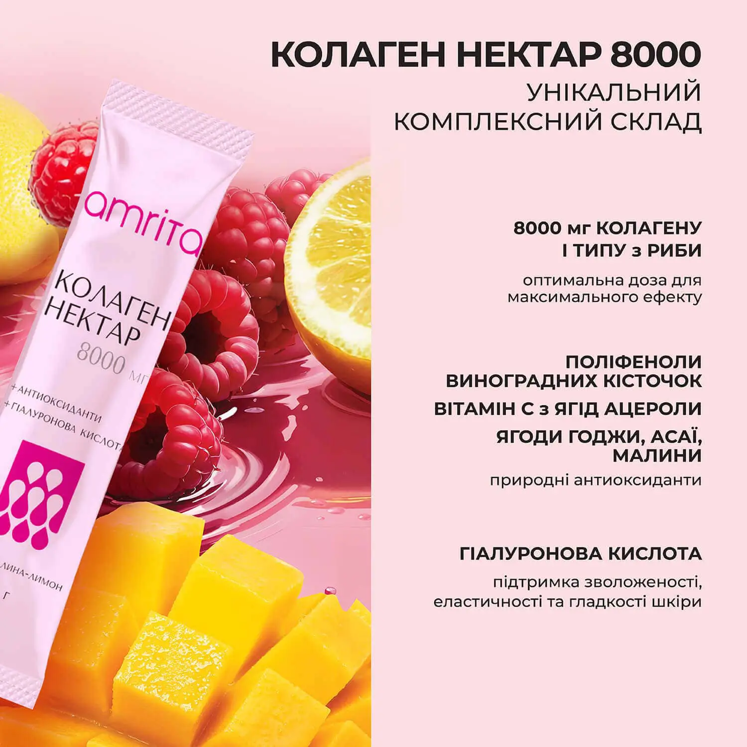 Колаген нектар 8000 мг від Amrita – преміальна експертна формула – оптимальне дозування для максимального ефекту! 8000 мг мультипептидів гідролізованого колагену І типу з риби (Франція), з комплексом антиоксидантів, гіалуроновою кислотою для здоров’я та підтримки пружності, гладкості, сяйва шкіри, міцного волосся та нігтів, рухливих суглобів та зв’язок.