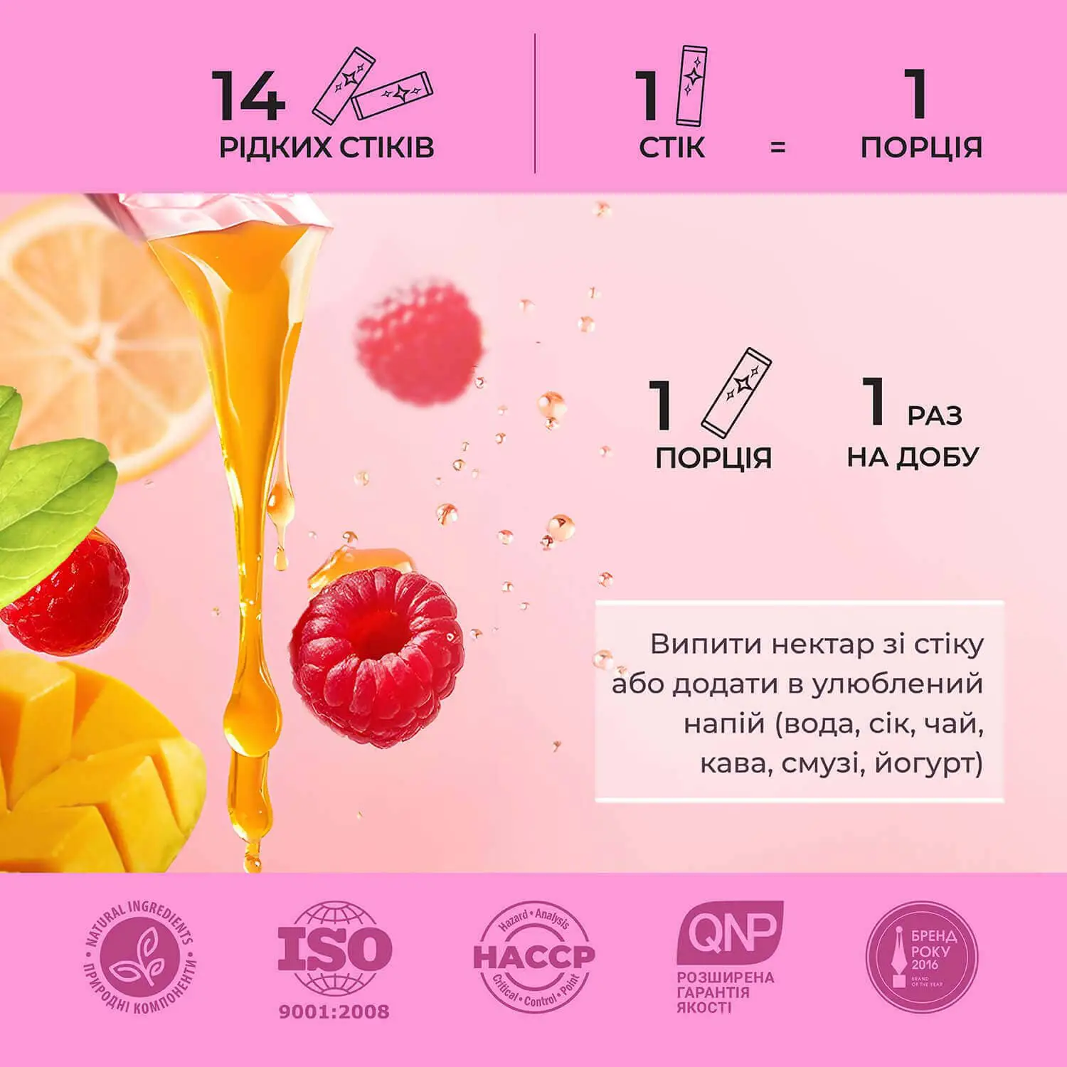 Спосіб застосування: по 1 порції (1 рідкий стік) 1 раз на добу, видавивши нектар прямо в рот або змішавши його з їжею чи напоєм на свій смак (водою, соком, чаєм, кавою, смузі, йогуртом і т.п.). Рекомендуємо приймати окремо від споживання білкової їжі або протеїнового коктейлю.