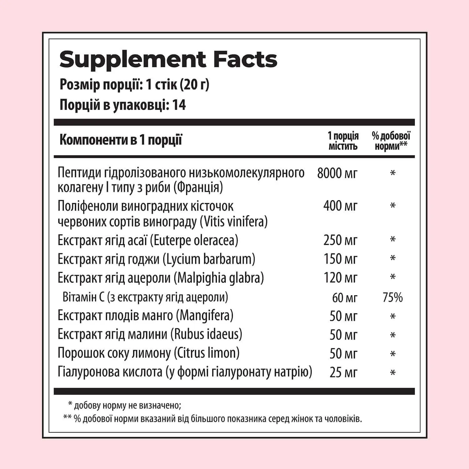 | * добову норму не визначено; ** % добової норми вказаний від більшого показника серед жінок та чоловіків. |