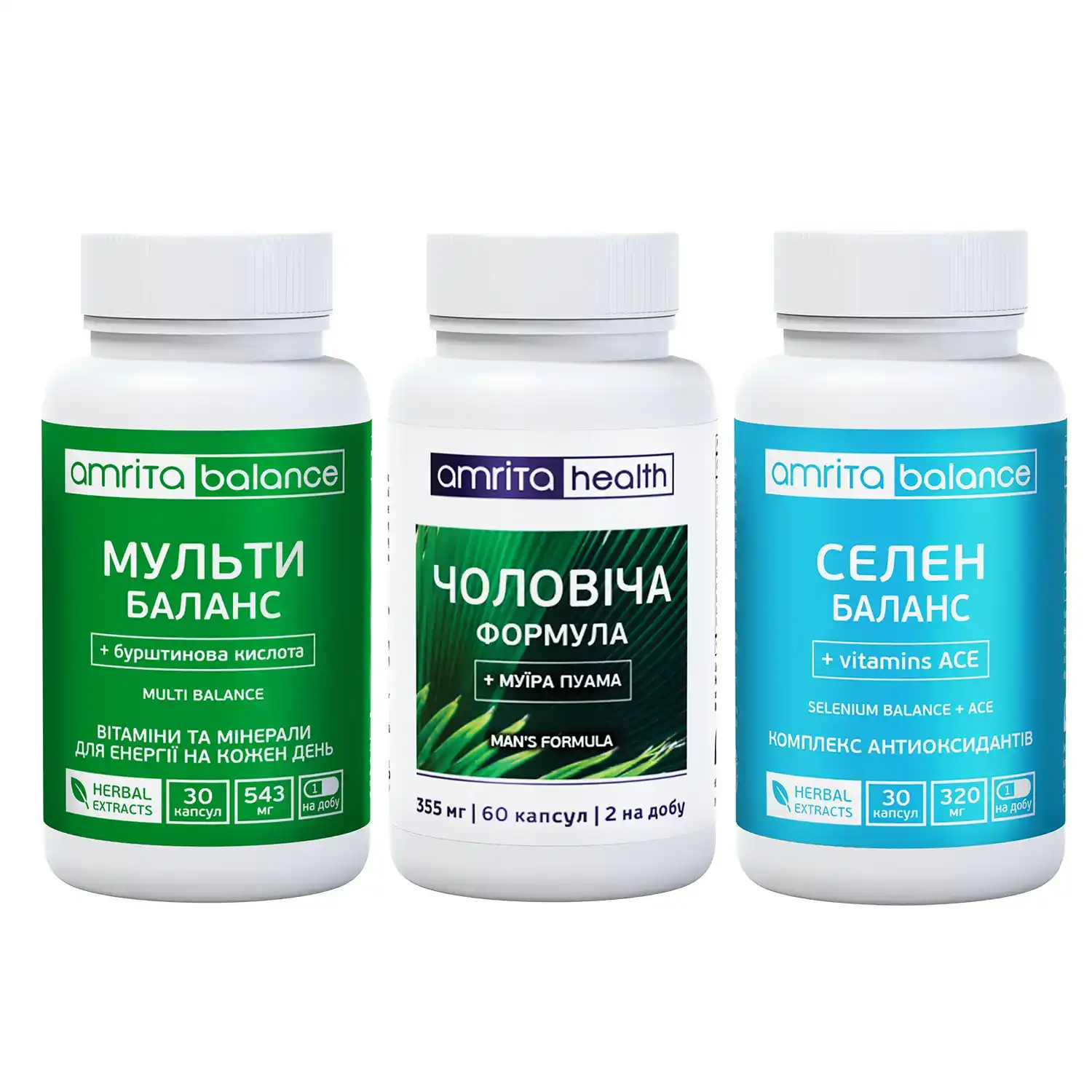 Базовий склад комплексу: «Чоловіча Формула + мyїpa пуама», «Мульти Баланс + бурштинова кислота», «Селен Баланс + АСЕ»