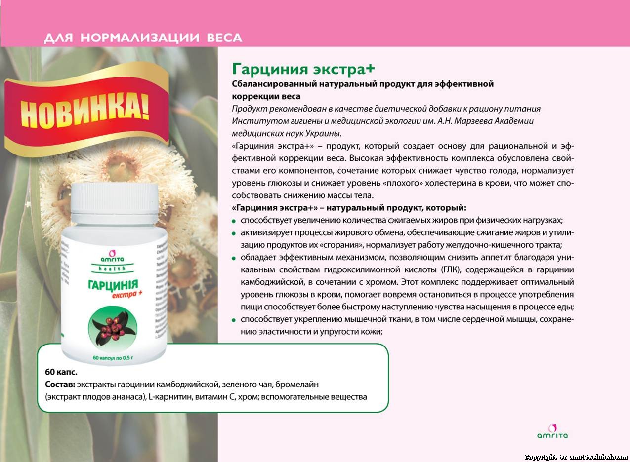До складу продукту «Гарцинія екстра плюс» входить Гарцинія камбоджійська, що містить гідроксилимону кислоту (ГЛК), яка працює на клітинному рівні, знижуючи апетит і тягу до солодкого. Також ГЛК сприяє блокуванню процесів синтезу жирних кислот і перетворення крохмалю і сахарсодержащіх продуктів в жири, їх подальше накопичення в організмі людини. Крім того, ГЛК перешкоджає утворенню надлишкового холестерину, покращує обмін речовин і підвищує енергетичний баланс організму. Процес блокування виробництва нового жиру призводить до спалювання раніше накопичених жирових відкладень. В результаті збільшується фізична та розумова працездатність. На відміну від синтетичних речовин, гарцинія не має шкідливого впливу на центральну нервову систему.