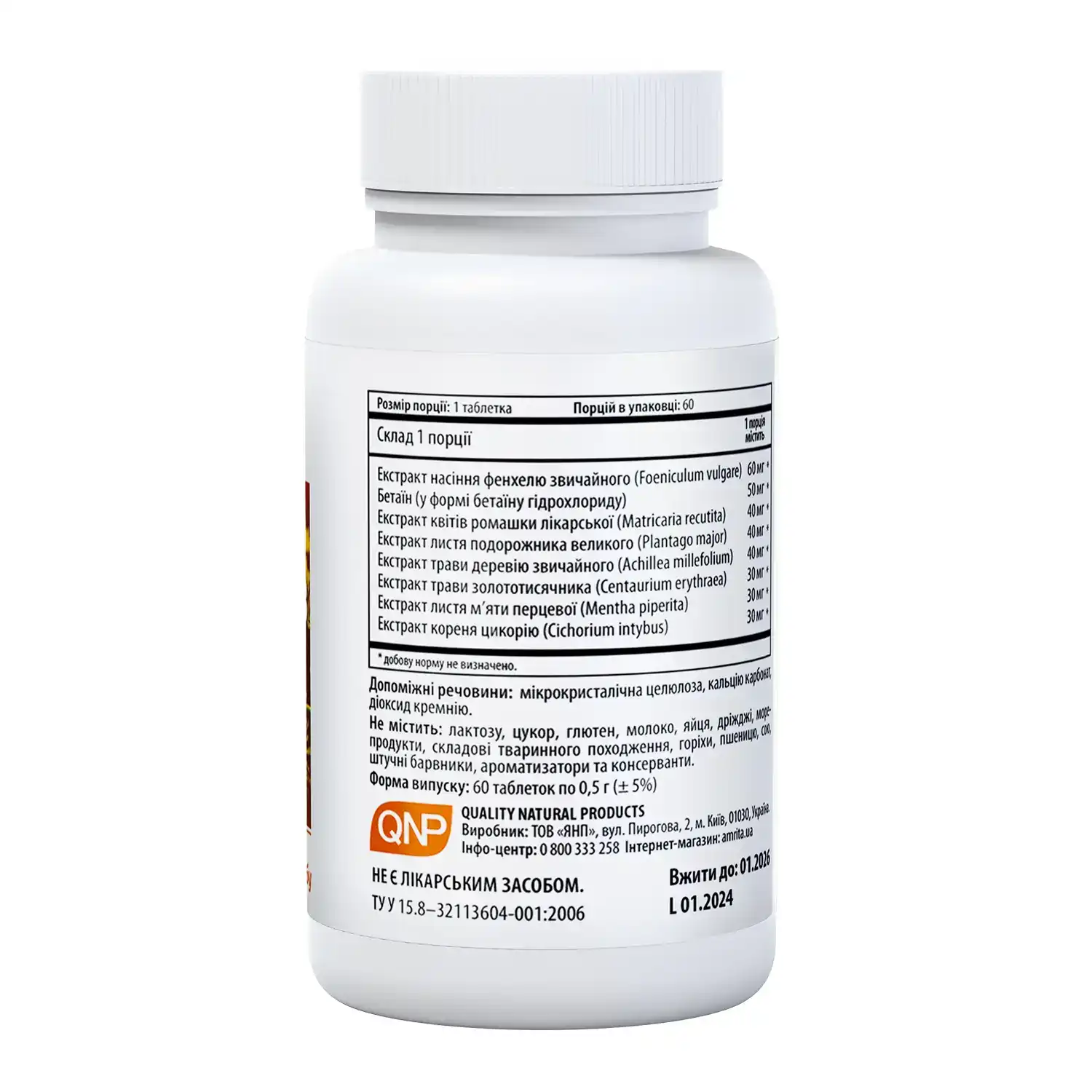 Активні компоненти: насіння фенхелю, бетаїн, ромашка, подорожник, деревій, золототисячник, м’ята перцева, цикорій.