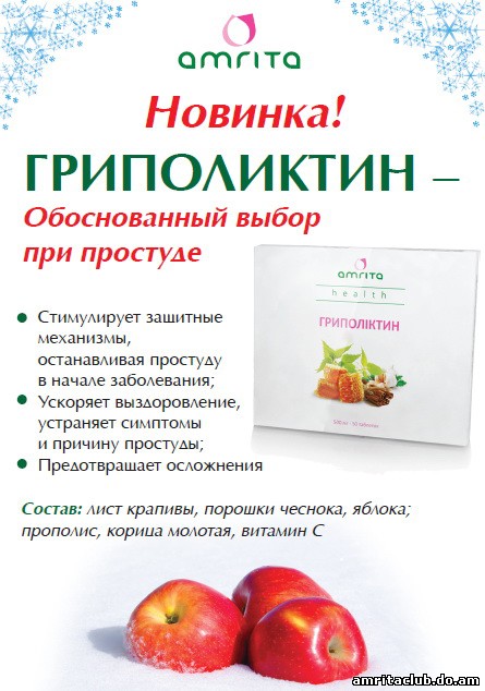 Гриполіктин – обгрунтований вибір при застуді! Компанія «Амріта» представляє Гриполіктин – натуральний продукт для профілактики та комплексного лікування застуди. До складу новинки входять лист кропиви, порошки часнику та яблука, прополіс, кориця мелена і вітамін С.