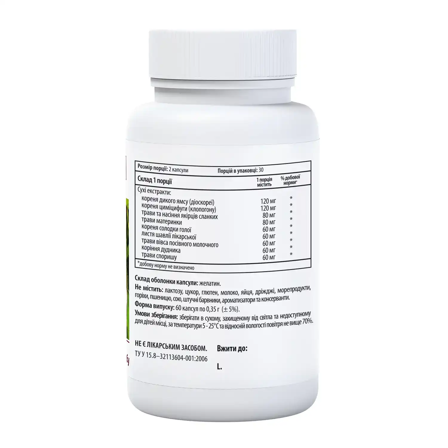 Активні компоненти: екстракт сухий коріння дикого ямсу (діоскореї), екстракт сухий коріння циміцифуги (клопогону), якірці сланкі, екстракт сухий трави материнки, солодка, шавлія, овес, дудник, спориш.