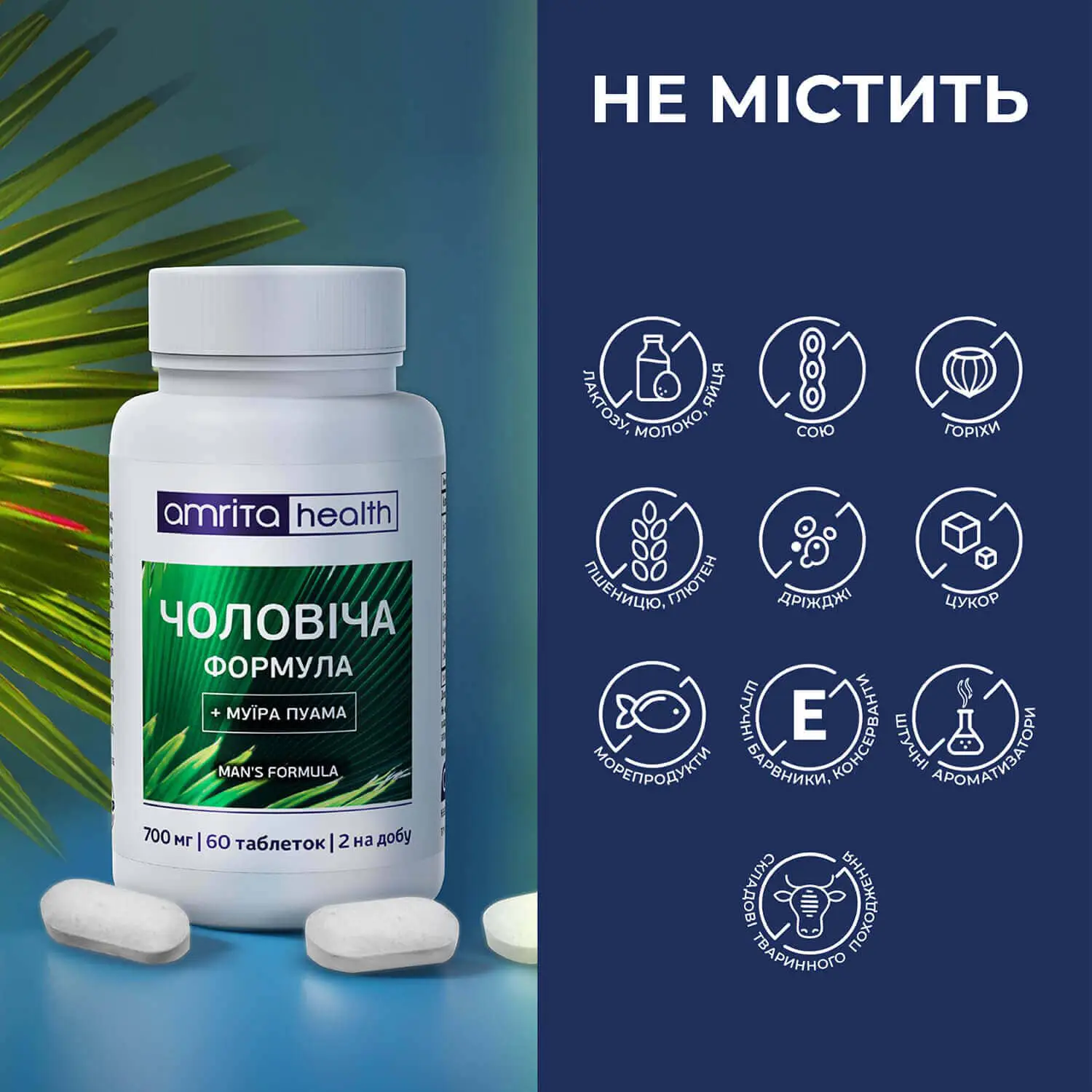 «Чоловіча формула + муїра пуама» від Amrita — посилена формула репродуктивного здоров’я. Джерело вітамінів, амінокислот та біологічно активних речовин з рослинних екстрактів для підтримки функцій органів репродуктивної системи чоловіків. Сприяє покращенню статевої функції та профілактиці захворювання простати. Сприяє посиленню лібідо, поліпшенню сперматогенезу (активності сперматозоїдів, здатних до запліднення, та їх кількість) та стану еректильної функції. Підвищує фізичну й розумову активність та витривалість, запобігає передчасному старінню, надає загальнозміцнювальну дію.