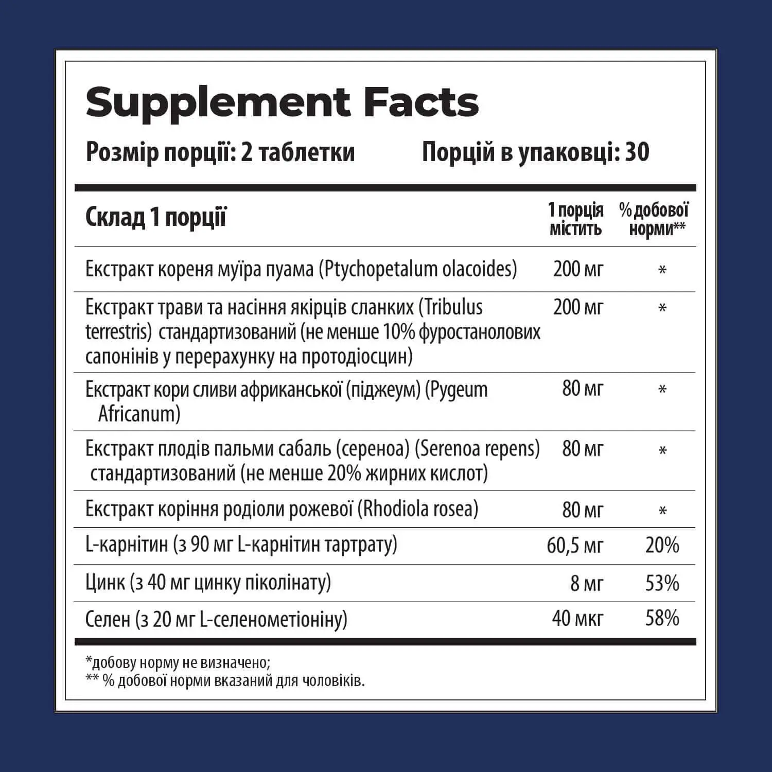 Активні компоненти: корень муїра пуама, стандартизований екстракт трави та насіння якірців сланких, слива африканська (піджеум), екстракт плодів пальми сабаль (сереноа, со пальметто), родіола рожева, L-карнітин, цинк, селен.