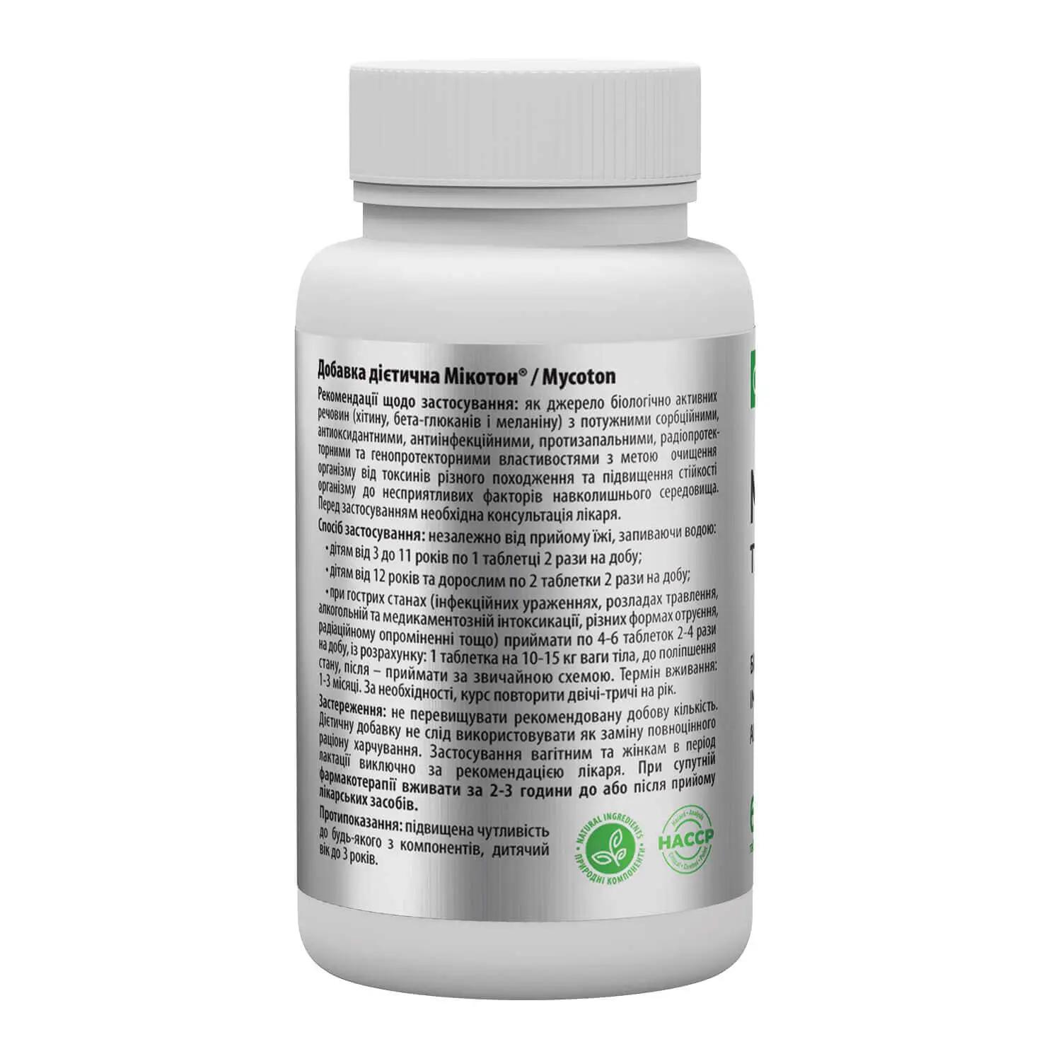 *Застереження при застосуванні: не перевищувати рекомендовану добову кількість. Дієтичну добавку не слід використовувати як заміну повноцінного раціону харчування. Застосування вагітним та жінкам в період лактації виключно за рекомендацією лікаря. Не вживати одночасно з лікарськими засобами. При прийомі фармацевтичних препаратів (супутній фармакотерапії), «Мікотон® таблетки» вживати за 3 години до прийому синтетичних лікарських препаратів, у т.ч. йодиду калію, або через 3 години після прийому (через можливу абсорбцію і, як наслідок, зниження ефективності їх застосування). Примітка. Якщо хімічний препарат довготривалої дії, то застосовувати «Мікотон® таблетки» лише за 3 години до прийому лікарського засобу.