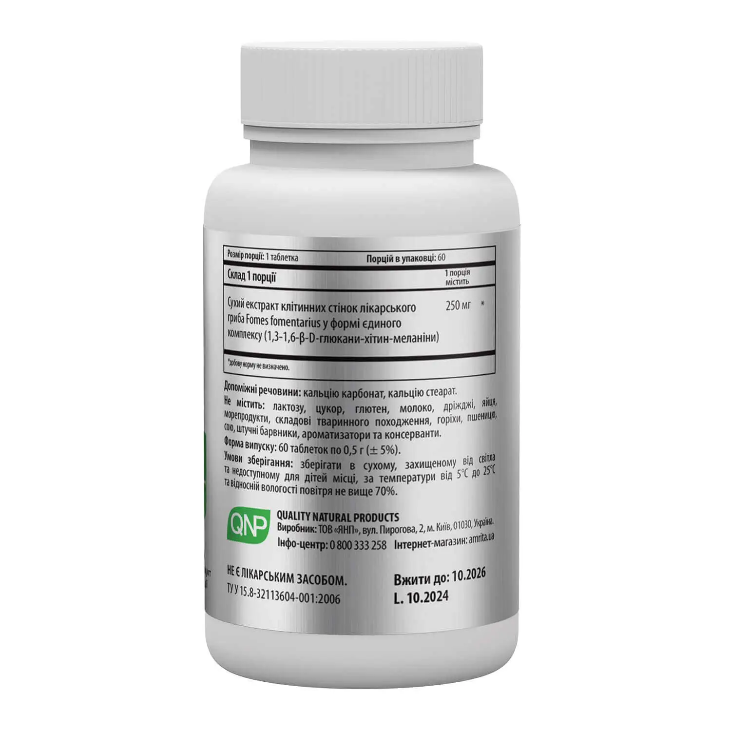| Сухий екстракт клітинних стінок лікарського гриба Fomes fomentarius (у формі єдиного комплексу 1,3-1,6-β-D-глюкани–хітин– меланіни) | 250 мг | * |