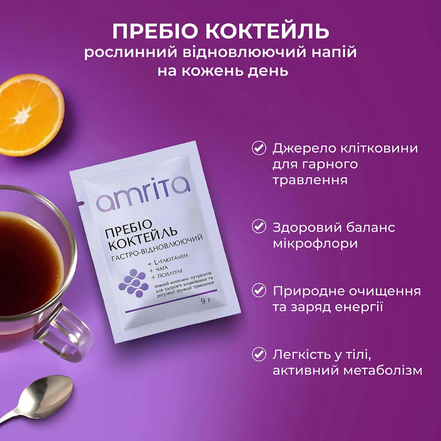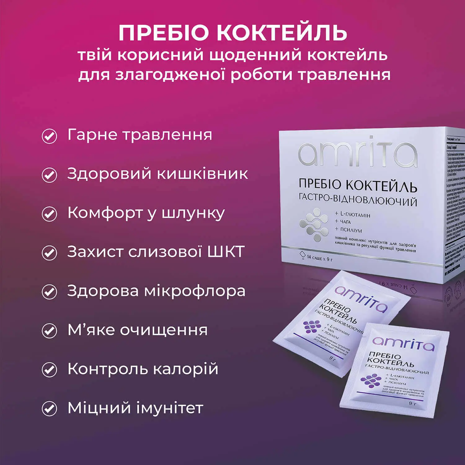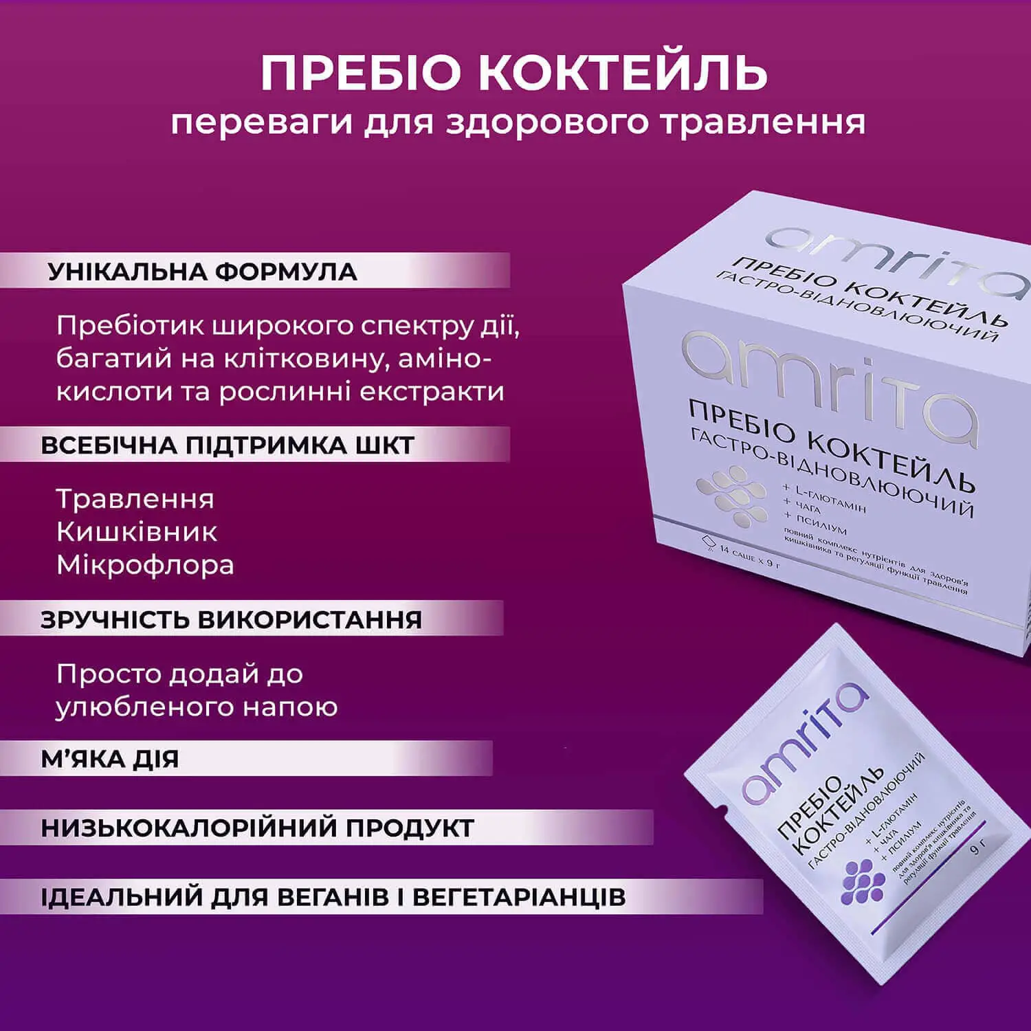 «Пребіо коктейль, гастро-відновлюючий» від Amrita – це повний комплекс поживних речовин (5-ти видів розчинної та нерозчинної клітковини, включно з полісахаридами гриба чаги, збагачених амінокислотами та рослинними екстрактами), допомагає забезпечити комфорт у шлунку, цілісність слизової та здорову роботу травлення. Сприяє відновленню функцій кишківника та його комфортному очищенню, підтримує здоровий баланс мікрофлори. Рослинний відновлюючий напій на кожен день, що дарує легкість у тілі та підтримує активний метаболізм!