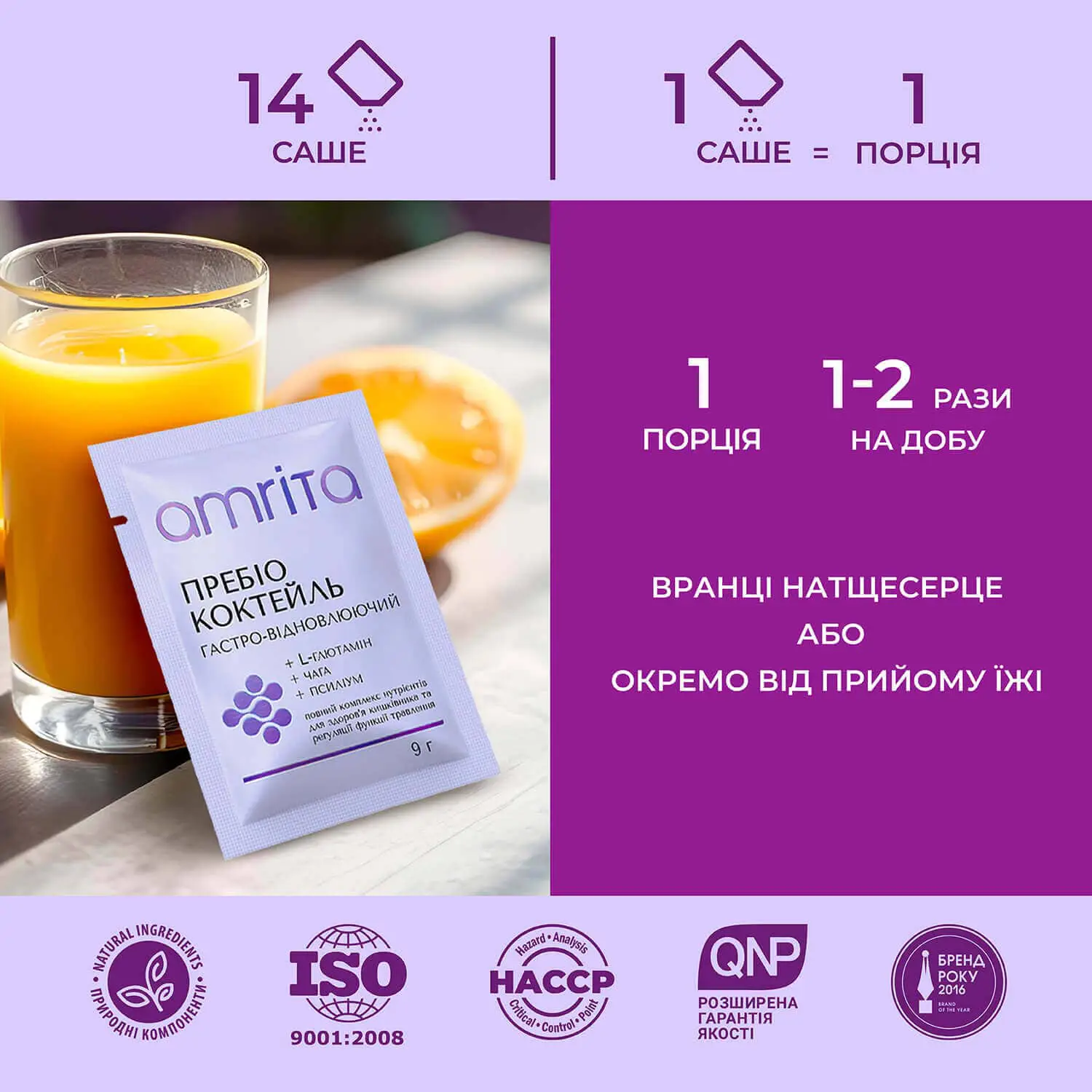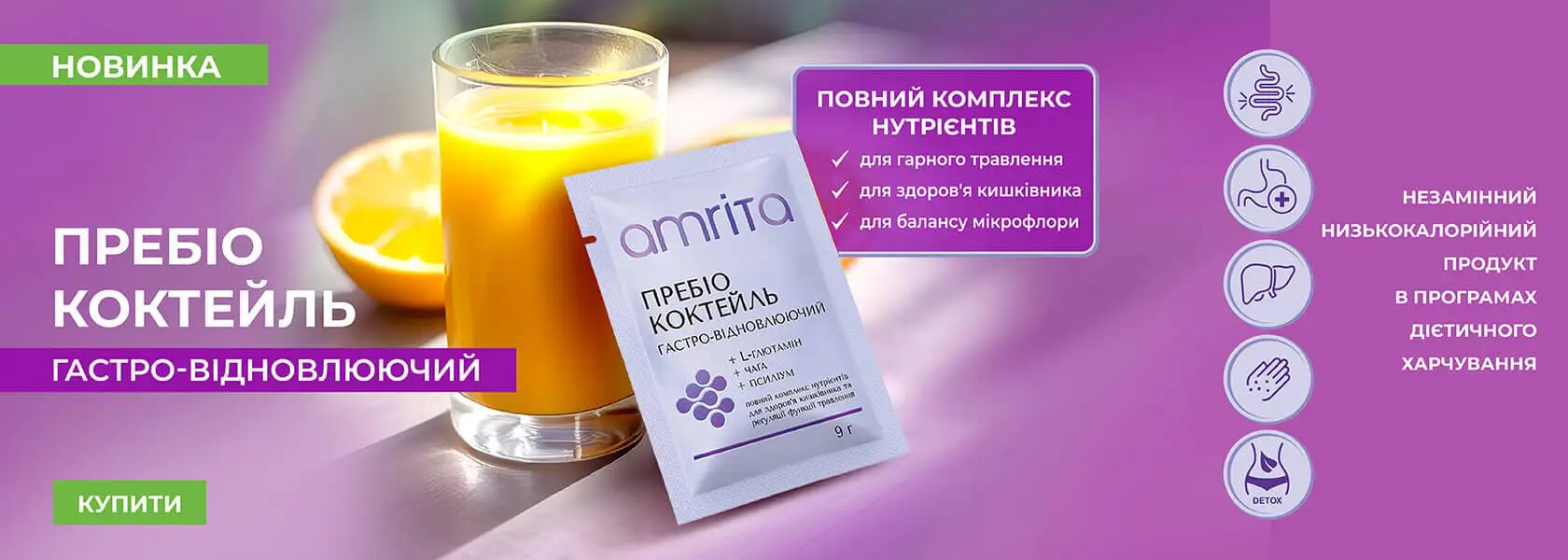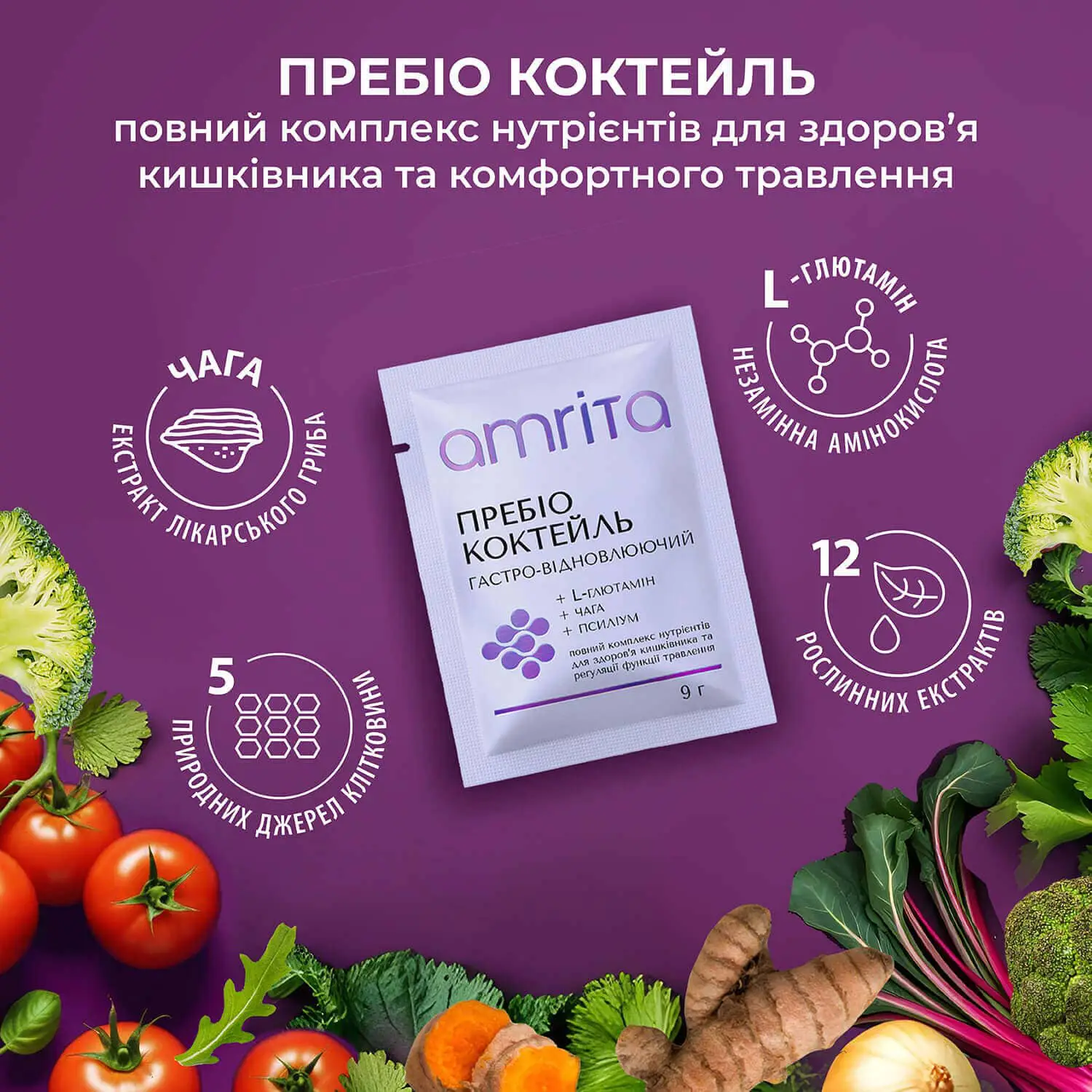 «Пребіо коктейль, гастро-відновлюючий» від Amrita – це повний комплекс поживних речовин (5-ти видів розчинної та нерозчинної клітковини, включно з полісахаридами гриба чаги, збагачених амінокислотами та рослинними екстрактами), допомагає забезпечити комфорт у шлунку, цілісність слизової та здорову роботу травлення. Сприяє відновленню функцій кишківника та його комфортному очищенню, підтримує здоровий баланс мікрофлори. Рослинний відновлюючий напій на кожен день, що дарує легкість у тілі та підтримує активний метаболізм!