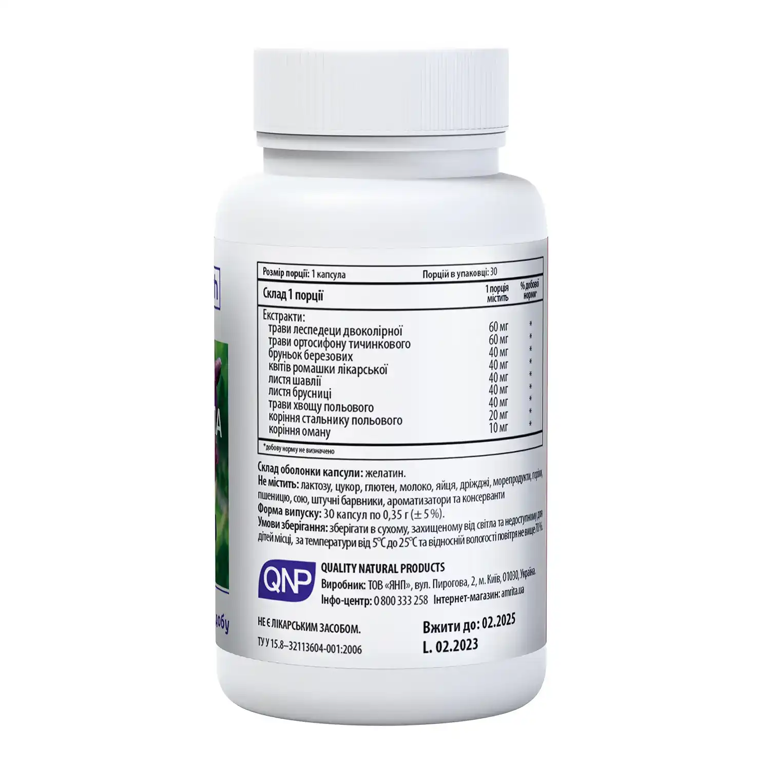 Активні компоненти: екстракти леспедези двоколірної, ортосифона тичинкового, березових бруньок, квітів ромашки лікарської, листя шавлії та брусниці, трави хвоща польового, коріння стальника польового та оману.