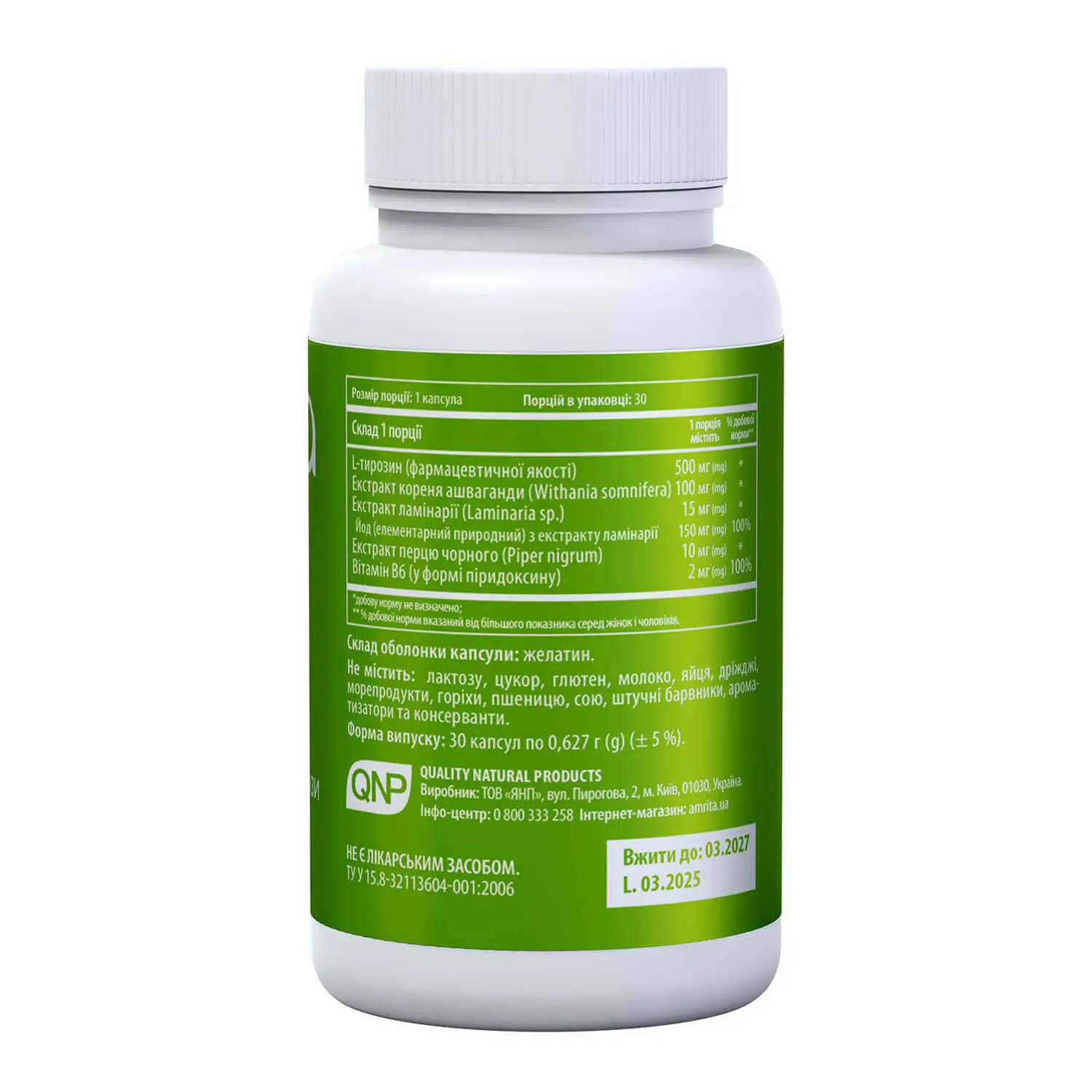 Активні компоненти: L-тирозин, ашваганда, ламінарія, природний йод, екстракт чорного перцю, вітамін В6.