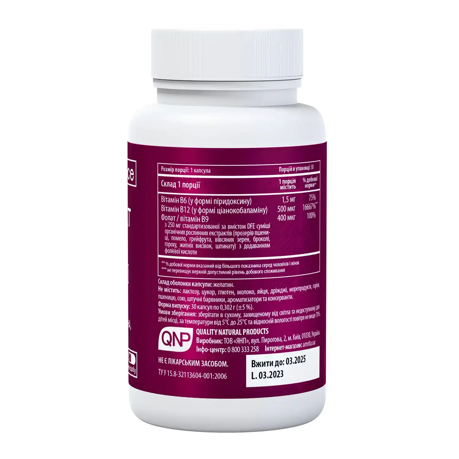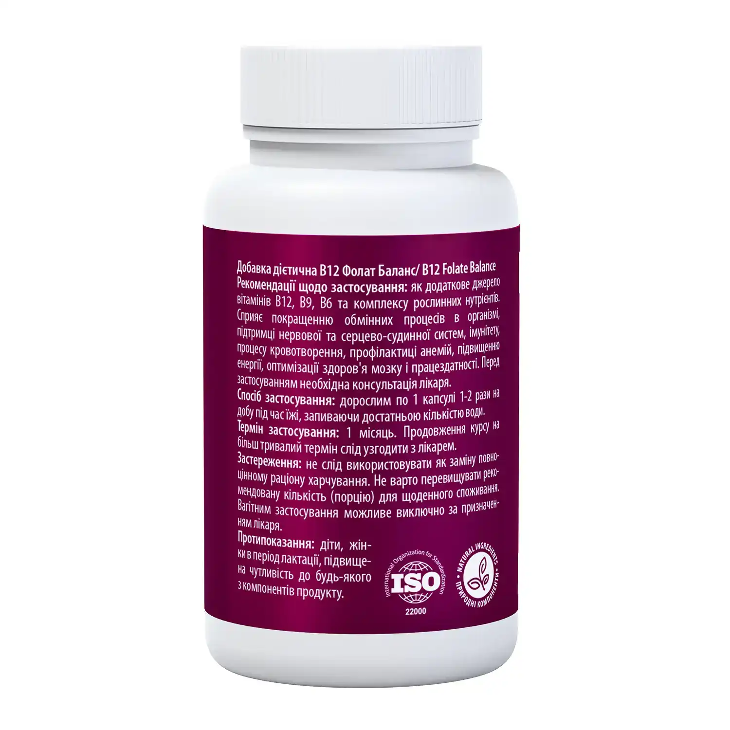 Рекомендації щодо застосування В12 Фолат Баланс (вітаміни B12 + B9 + B6): як додаткове джерело вітамінів B12, B9, B6 та комплексу рослинних нутрієнтів. Сприяє покращенню обмінних процесів в організмі, підтримці нервової та серцево-судинної систем, імунітету, процесу кровотворення, профілактиці анемій, підвищенню енергії, оптимізації здоров’я мозку і працездатності. Перед застосуванням необхідна консультація лікаря.
